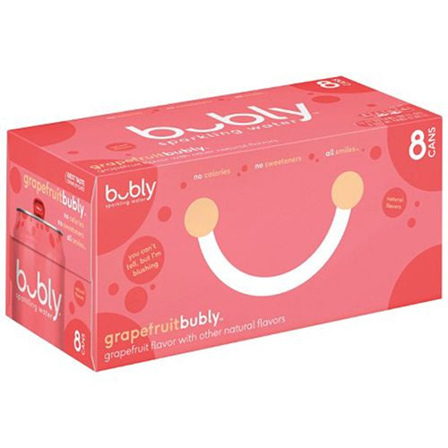 Includes (8) 12 oz cans of bubly sparkling water, Grapefruit flavorRefreshing, crisp bubly sparkling water with great tasting, natural flavorsNo calories. No sweeteners. All smilesEach flavor comes with a different smile and greeting to match its unique personalitybubly aluminum cans are recyclable! 100% of the can's materials can be reused during the recycling process so natural resources are preserved.