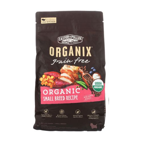 Castor & Pollux Organix Grain-Free Small breed recipe Dry Dog Food is a delicious specially formulated Dog Food designed to supplement and support health in smaller breeds. Made primarily with natural ingredients is largely free of unnatural and unnecessary additives. This product is organic and does not contain added colors hormones antibiotics artificial preservatives or grain. Each bag Weighs 4 lbs. See Label for Warnings.