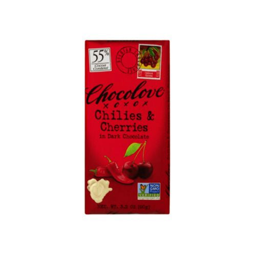 CHOCOLOVE CHILIES AND CHERRIES IN DARK CHOCOLATE BAR IS A 3.2 OZ. BAR MADE WITH ANCHO AND CHIPOTLE CHILIES THAT SUPPLY THE HEAT AND DRIED CHERRIES THAT SUPPLY THE SWEET IN THIS DELICIOUSLY EXCITING CHOCOLATE. INITIAL CHILI FLAVORS TRANSITION TO A DEEP SWEET CHERRY AND FINISH AGAIN ON A PLEASANTLY WARM NOTE. THE STIMULATING EFFECTS OF CHILIES AND CHOCOLATE WILL WARM YOUR HEART. OUR CHOCOLATE IS MADE WITH COCOA CERTIFIED BY IMO AS FOR LIFE WHICH MEANS IT WAS FARMED IN A SOCIALLY RESPONSIBLE AND ETHICAL MANNER. ALL OF THE COCOA BEAN DERIVED INGREDIENTS IN THIS CHOCOLATE ARE CERTIFIED FOR LIFE. SEE THE NUTRITION FACTS PANEL FOR ALLERGENS.