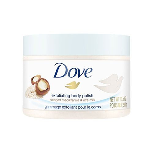 Gently buff away dry dull skin with Dove Macadamia and Rice Milk Exfoliating Body Polish. Made with ? moisturizing cream this gentle exfoliating body scrub restores skin?s nutrients as it exfoliates leaving your skin feeling silky smooth. With easily spreadable texture this Dove body exfoliator gives you beautifully creamy coverage while releasing a gently herbal and floral hypoallergenic fragrance. Get all the effectiveness you?d look for in exfoliators or a shower scrub but with the nourishment and care that your skin needs in the shower. Try Dove Body Polish to get beach-ready skin prep skin for tanning or to help exfoliate before shaving to help prevent ingrown hairs. You ll love the feeling of silky smooth skin all over. Plus when you buy Dove you can be assured you?re caring for your skin with products that are PETA Cruelty-Free certified.