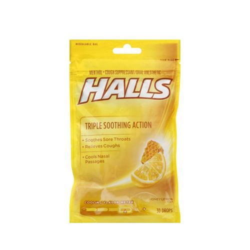 HALLS Relief Honey Lemon Cough Drops are ready for whatever life throws or coughs your way. With 7.5 mg of menthol per drop these throat lozenges relieve coughs soothe sore throats and cool nasal passages to relieve your worst symptoms. This effective cough suppressant comes in a refreshing yet soothing honey lemon flavor. Whether you re using HALLS cough drops for sore throat relief cough relief or as an oral anesthetic simply dissolve one drop in your mouth slowly and repeat every two hours as needed. HALLS Relief cough drops are formulated for adults and children five years and older. This bag holds 30 individually wrapped drops and is resealable making it ideal for stowing in your travel pack purse or desk drawer. These packs are also perfect inclusions in a healthy gift or care package.