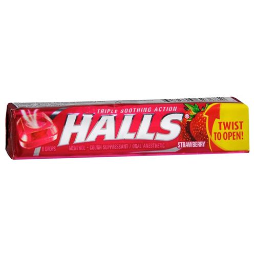 Cough Drops Strawberry Wrapper 9 CT Other Information: 15 calories per drop. Contains: soy. Misc: Soothes & relieves. Soothes sore throats. Relieves coughs. Questions? Call 1-800-524-2854 Monday to Friday 9 AM-6 PM Eastern Time or visit our website at www.gethalls.com. Made in Canada. Uses: Temporarily Relieves: cough due to a cold; occasional minor irritation or sore throat. Adults and Children 5 Years and Over: Dissolve 2 drops (one at a time) slowly in the mouth. Repeat every 2 hours as needed. Children Under 5 Years: Ask a doctor. Warnings: Sore throat warning: If sore throat is severe persists for more than 2 days is accompanied or followed by fever headache rash swelling nausea or vomiting consult a doctor promptly. These may be serious. Ask a doctor before use if you have persistent or chronic cough such as occurs with smoking asthma or emphysema; cough accompanied by excessive phlegm (mucus). Stop use and ask a doctor if: cough persists for more than 1 week tends to recur or is accomp
