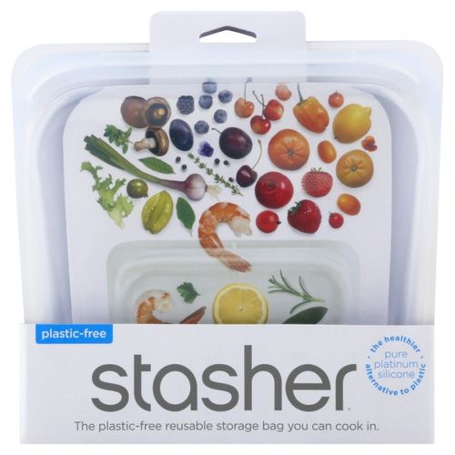 With everything you put into healthy food choices a more thoughtful storage bag only makes sense. Easy to use easy to clean reusable and non-toxic Stasher bags fit you perfectly. Stasher can take the heat the cold and anything else your kitchen dishes out. Thanks to the patented airtight seal all of your food? s nutrients flavors and juices stay locked in. Stasher can defrost or cook food in minutes. Tip: Just leave bag open and place in microwave. Oven: Place on oven-safe pan directly in oven leave seal open. Sous vide: Fill Stasher bag do not seal. Slowly lower into water allow air to escape and vacuum to form around contents before sealing. Place in upper rack for best results or hand wash with soap + warm water. Freezer safe and ideal for food storage. Stasher lets you make meals ahead of time and easily store whatever? s leftover. Tip: Use dry erase markers to label contents. * Stasher bag is the world s first fully functional self-sealing non-plastic bag * The award-winning Stasher bag