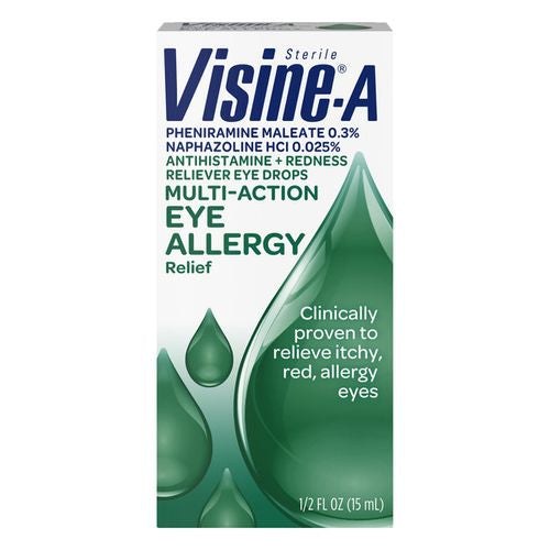 Temporarily relieve itchy red eyes due to allergies with Visine ?A Antihistamine + Redness Multi-Action Eye Allergy Reliever Eye Drops. This formula contains.3 percent pheniramine maleate an effective antihistamine clinically proven to relieve redness and...